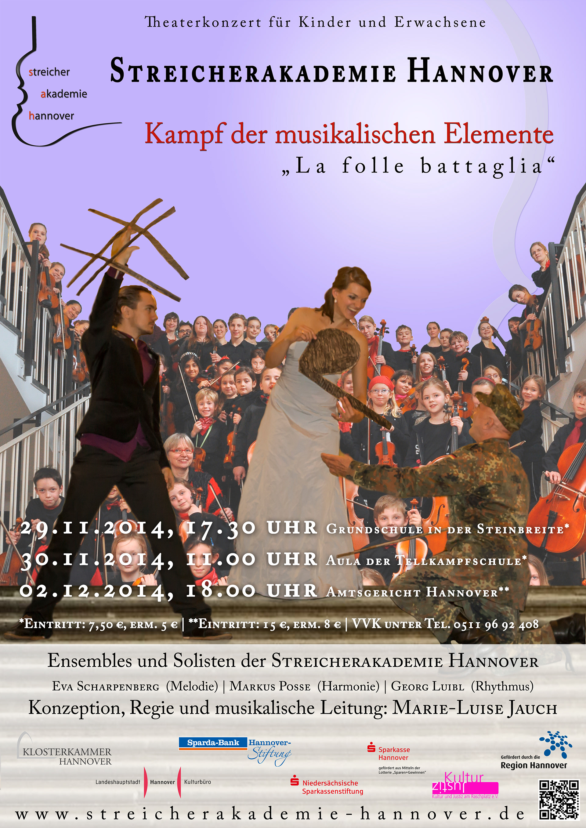Nevertheless, we enjoy listening and relish the interplay of various musical subtleties just as much as the acoustic struggle over who or what sets the tone. Most of the time, however, this happens rather unconsciously. A project that brings precisely these rivalries to light is currently taking shape in Hanover. Under the direction of Marie-Luise Jauch, the Streicherakademie Hannover is developing a staged concert dedicated to the “battle of the musical elements.” In the project of the same name, the three main sources of musical conflict are embodied by actors. Melody (Eva Scharpenberg), Rhythm (Georg Luibl), and Harmony (Markus Posse) battle one another. A clash ensues somewhere between major and minor, but never without sound! The Streicherakademie’s intergenerational and interdisciplinary ensemble accompanies the whole with a repertoire ranging from Vivaldi to Gershwin. The musicians, young and old, thus provide the individual parties (not always) with the right arguments, but certainly enough material to discuss—and perhaps even “attack”? The highlight of the concert is a piece composed specifically for the project, in which all three quarrelsome elements get their comeuppance: La Folle Battaglia—the crazy battle. Whether understood as a metaphor or as a playful journey into the depths of musical functionality—with the “Battle of the Musical Elements,” the Streicherakademie brings a concert experience to the stage that can interest everyone: with a little action, plenty of wit, and, of course, an exciting range of music.
