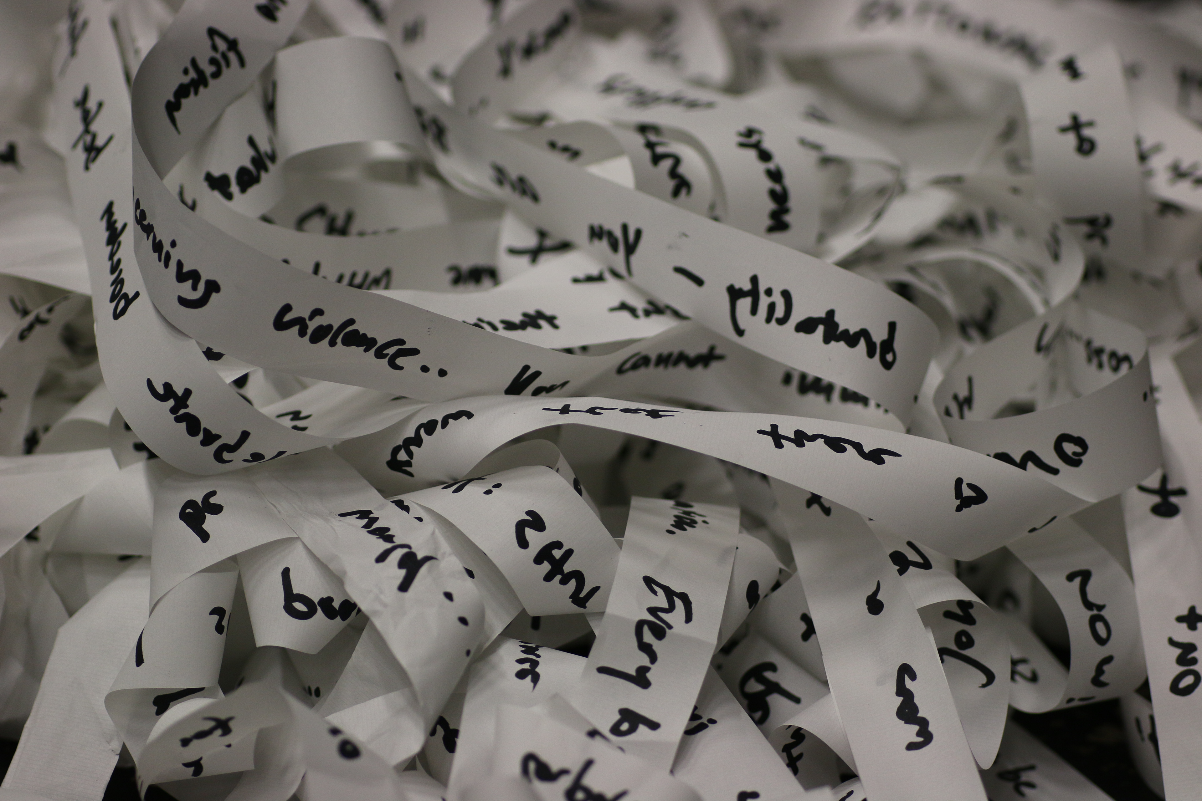 "Rehearsing Peace" is a research process on contemporary peace strategies and abundant thought bodies. It started with the premise that too much thinking threatens peace. Hence, the idea was to externalize my and the audience's thoughts by writing them down and thus, materializing them. I like to work with paper coils as a medium to display thought. Just like thoughts, they are delicate, fragile, and they resist your willingness to control their path. In the frame of a residency, I was able to develop a performative “peace diary". Using performative references to existing rituals, I wanted to explore whether a cult of sacrifice can still be relevant in light of the current state of the world, and how much spirituality can still be “tolerated.” The preliminary results conculuded with a series of photographies, a workshop score and a performative flirt with an imaginary audience.